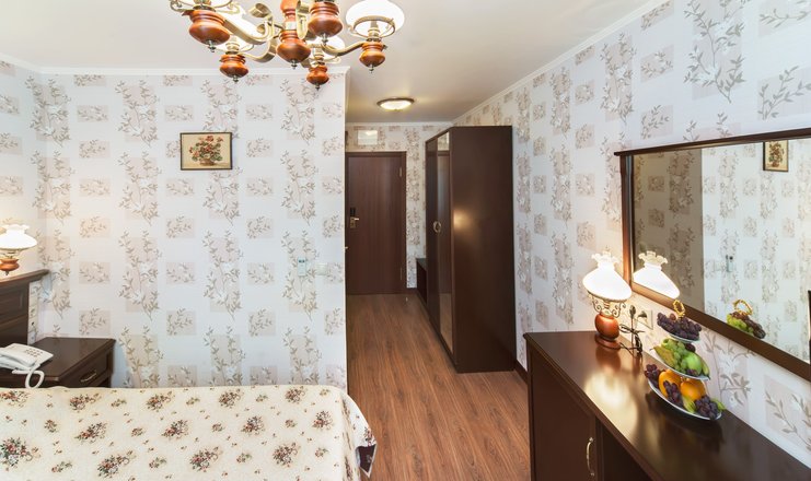 В номере: односпальная кровать (140*200 см.), тв цифровое, телефон, кондиционер, мини-холодильник, письменный стол, стул, зеркало, настольная лампа, бра, гардероб с вешалками, вешалка для верхней одежды, багажница, чайник и чайная пара (блюдце с чашкой)