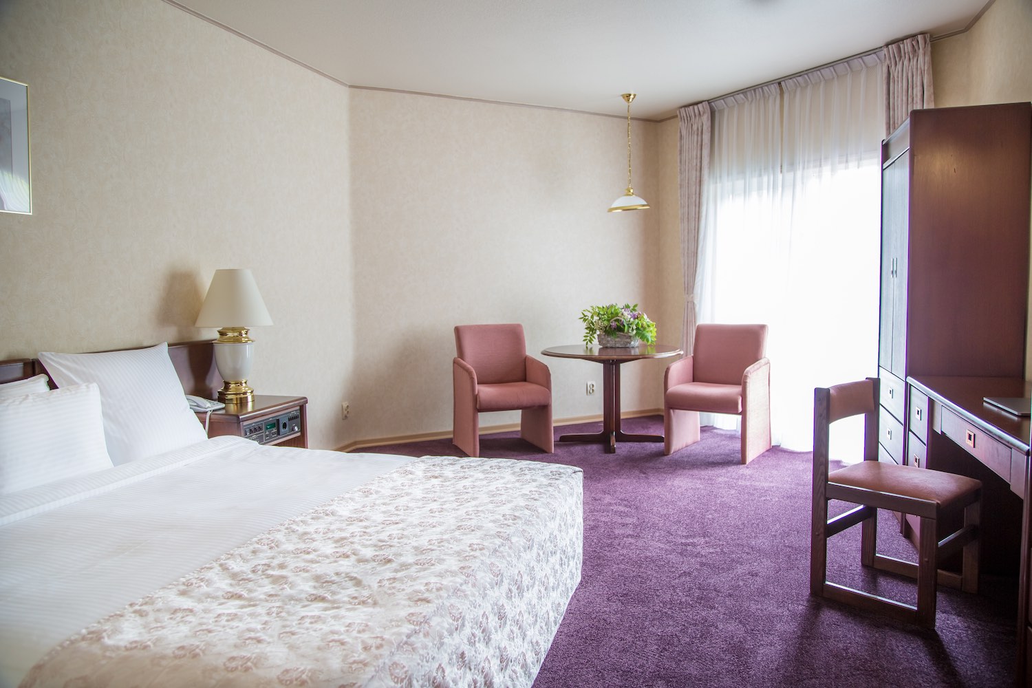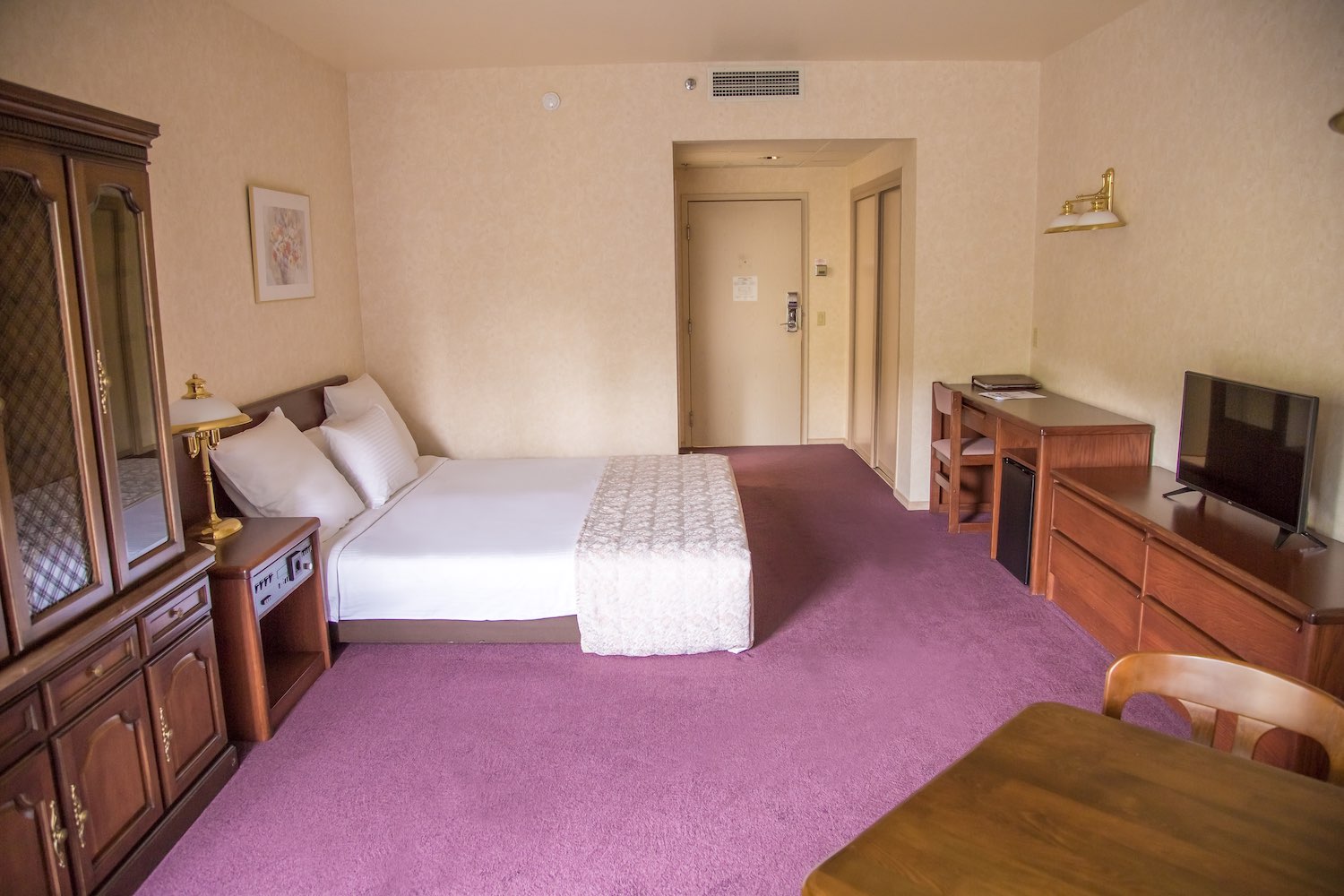 В номере: вешалка, зеркало, кровать двуспальная, прикроватные тумбочки, стол, стулья, шкаф, индивидуальная система обогрева, кондиционер, мини-холодильник, сейф, телевизор, телефон, электрочайник