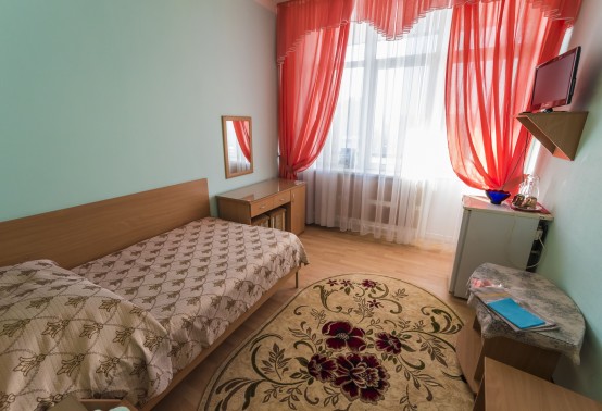 В номере: полутораспальная кровать, прикроватная тумбочка, встроенный шкаф, стол, кресло, телевизор, холодильник, телефон, набор посуды